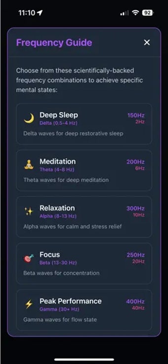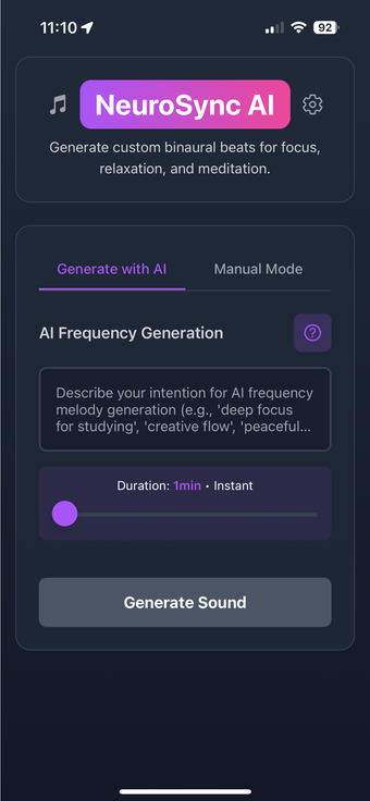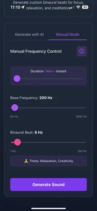 Aparte de generar utilizando IA, también puedes introducir manualmente frecuencias específicas, estados de ánimo o duraciones de sesión para crear una experiencia de ritmo binaural personalizada. Su interfaz es limpia e intuitiva. Sin embargo, las funciones premium son caras, ya que requieren una suscripción mensual o anual.